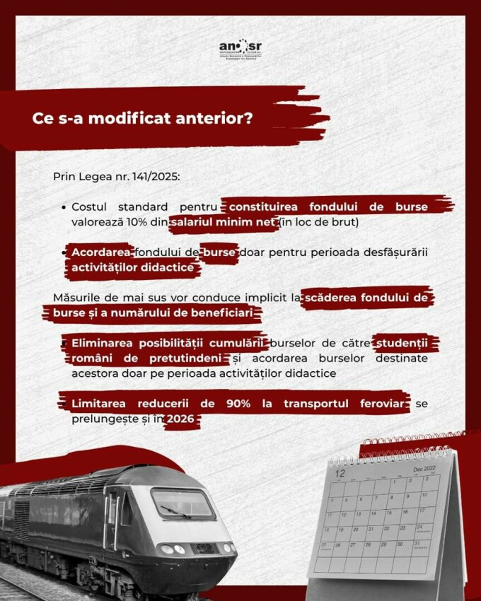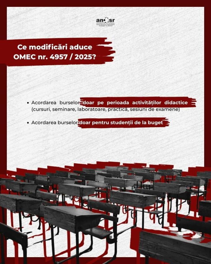 ”Reamintim faptul că, în urma adoptării Legii nr. 141/2025, fondul de burse se calculează prin raportarea la salariul minim net, în locul celui brut, fapt ce va aduce o scădere de aproximativ 40% a fondului și, în consecință, scăderea numărului de beneficiari, iar alocarea acestuia se va realiza doar pe perioada desfășurării activităților didactice, nu și pe durata vacanțelor, reducându-se astfel suplimentar fondul total de care vor dispune instituțiile de învățământ superior.