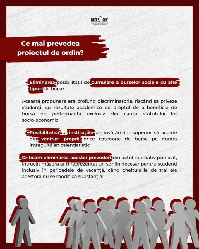 De asemenea, studenții își exprimă ”profunda dezamăgire și îngrijorare cu privire la eliminarea posibilității studenților care studiază la forma de finanțare cu taxă de a beneficia de burse și limitarea perioadei de acordare a burselor exclusiv pe perioada desfășurării activităților didactice, modificări survenite în sistemul de acordare a burselor pentru studenți ca urmare a adoptării Ordinului nr. 4957/2025”.